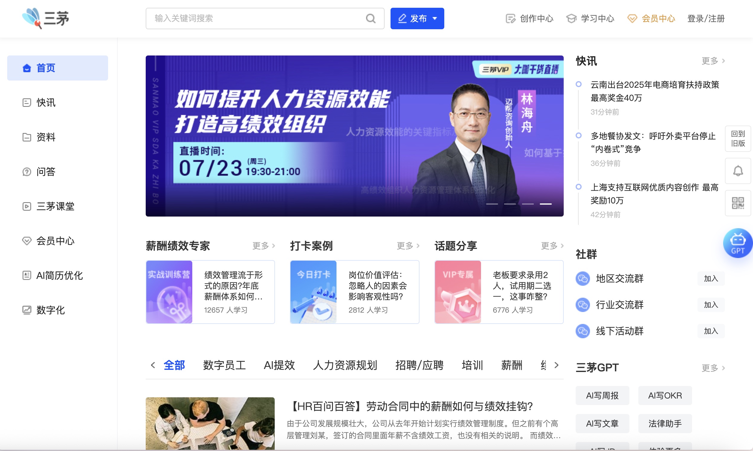 三茅HR之家為社群成員提供全方位的價(jià)值服務(wù),打造高質(zhì)量的HR專業(yè)社群